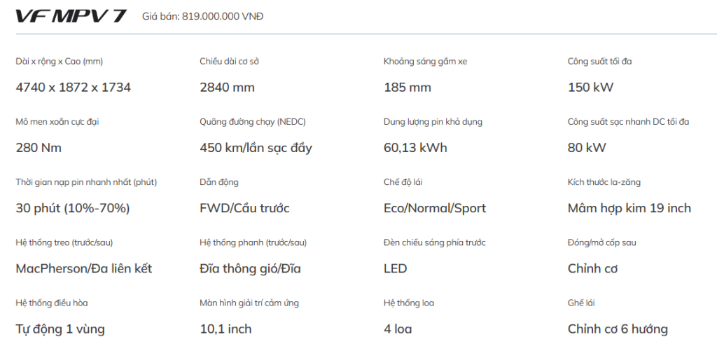 Chi tiết thông số kỹ thuật VINFAST MPV7
