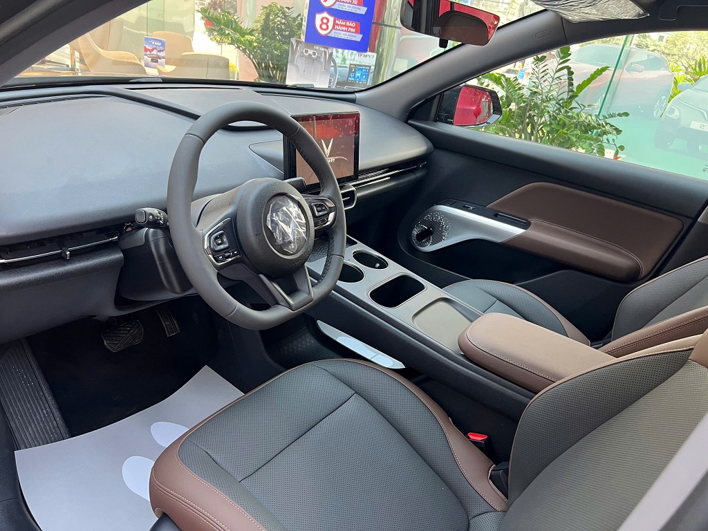 Nội thất thiết kế đặc trưng VinFast, phong cách hiện đại và tiện nghi. Xe trang bị vô-lăng đáy phẳng thể thao, bọc da và tích hợp nhiều phím bấm điều khiển chức năng. Cần số điện tử đặt sau vô-lăng. Màn hình thông tin giải trí 10,1 inch, hỗ trợ kết nối Apple CarPlay/Android Auto.